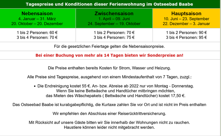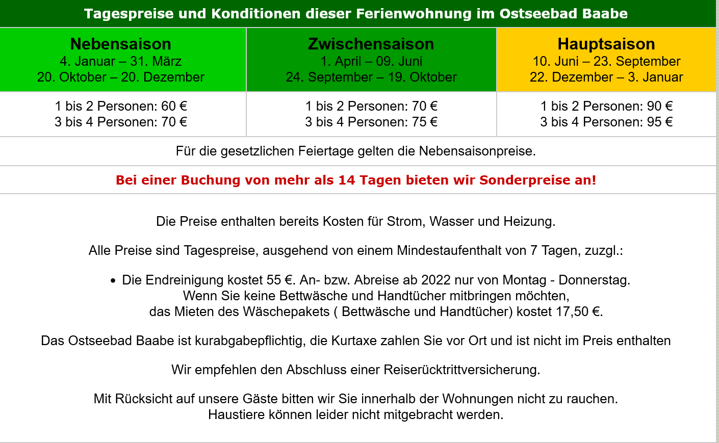 An der beliebten und verkehrsberuhigten Strandstraße des Ostseebades Baabe erwartet Sie eine komfortable Ferienwohnung: Sie befindet sich auf der ruhigen Rückseite eines Apartmenthauses und liegt dort vollständig im Erdgeschoss. 80 Quadratmeter Terrassenfläche gehören zu ihr, ausgestattet mit modernen Terrassenmöbeln für gemütliche Abende. Die Lage dieser Ferienunterkunft ist ideal für Strandurlauber: Gerade einmal 200 Meter trennen Sie vom feinsandigen Ostseestrand und dem Meer. Außerdem verläuft die Baaber Flaniermeile mit ihren gemütlichen Cafés und Restaurants unmittelbar am Haus vorbei. Diese moderne Ferienwohnung wurde für 4 Personen ausgelegt und bietet neben einem Wohn-/Esszimmer mit moderner Küche auch ein separates Schlafzimmer sowie ein Bad mit Dusche und WC. Sofern Sie selber kochen möchten, können Sie alles Notwendige schnell in einem der 3 örtlichen Supermärkte erwerben.